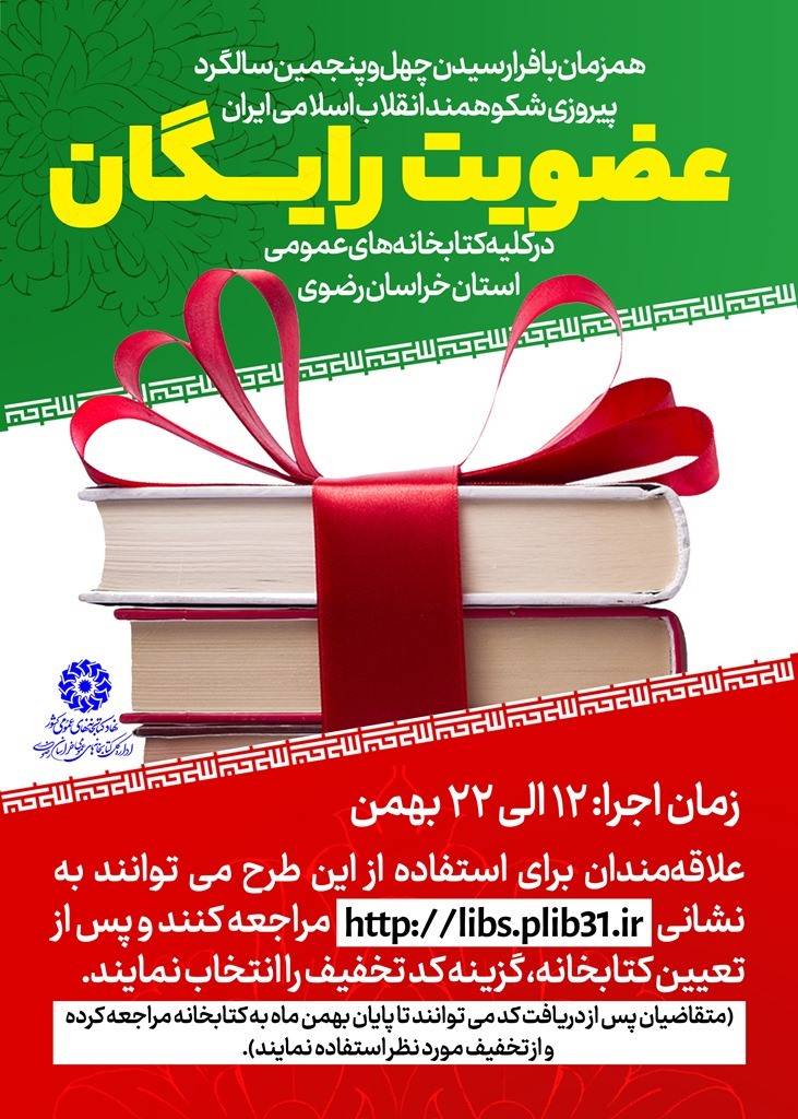 همزمان با فرا رسیدن 45مین سالگرد پیروزی انقلاب اسلامی ایران طرح بخشودگی جرائم دیرکرد کتابهای امانتی و عضویت رایگان در تمامی کتابخانه های عمومی استان خراسان رضوی اجرا می شود.