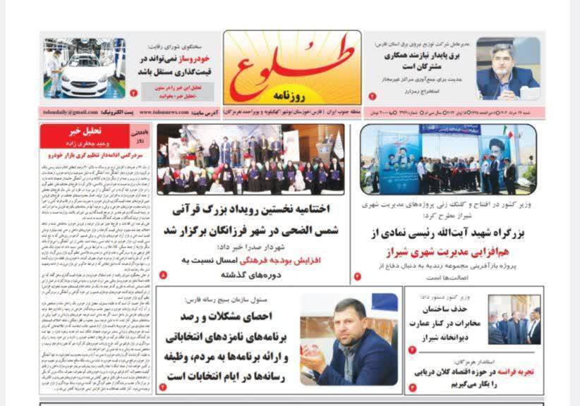تابناک فارس به نقل از صدا و سیما: روزنامه‌های فارس شنبه ۲۶ خرداد ۱۴۰۳ به موضوعات مختلف استان و کشورمان پرداخته اند.